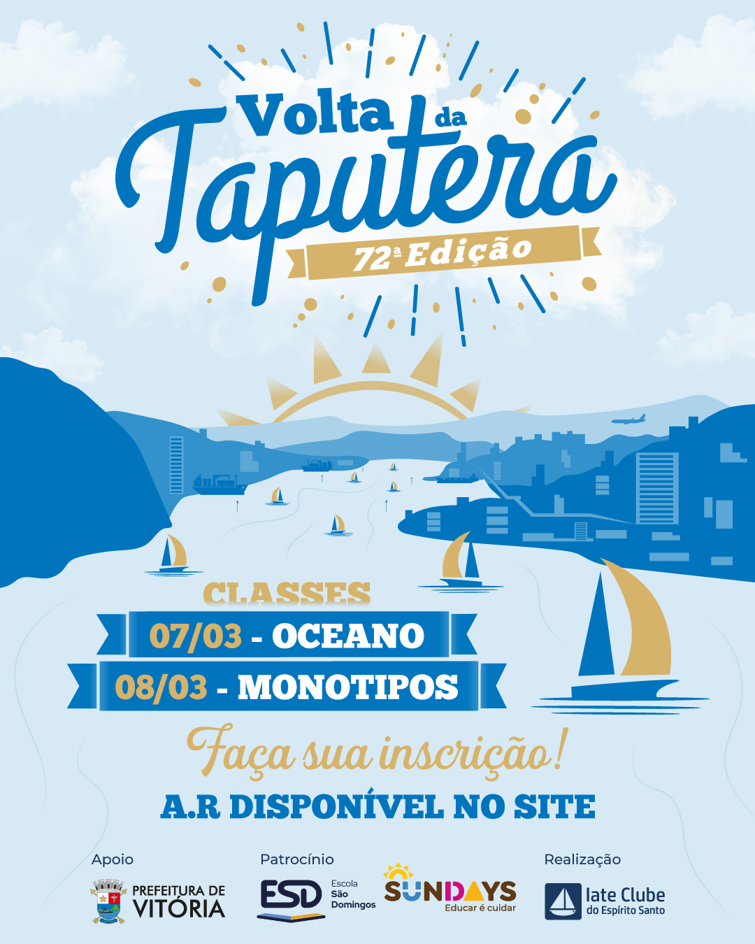 Neste sábado e domingo acontece a 72ª Regata Volta da Taputera, uma das competições mais tradicionais do calendário náutico capixaba. A prova é realizada pelo Iate Clube do Espírito Santo na Baía de Vitória, com um percurso emocionante na água que passa pelo centro da cidade e por pontos marcantes da baía.